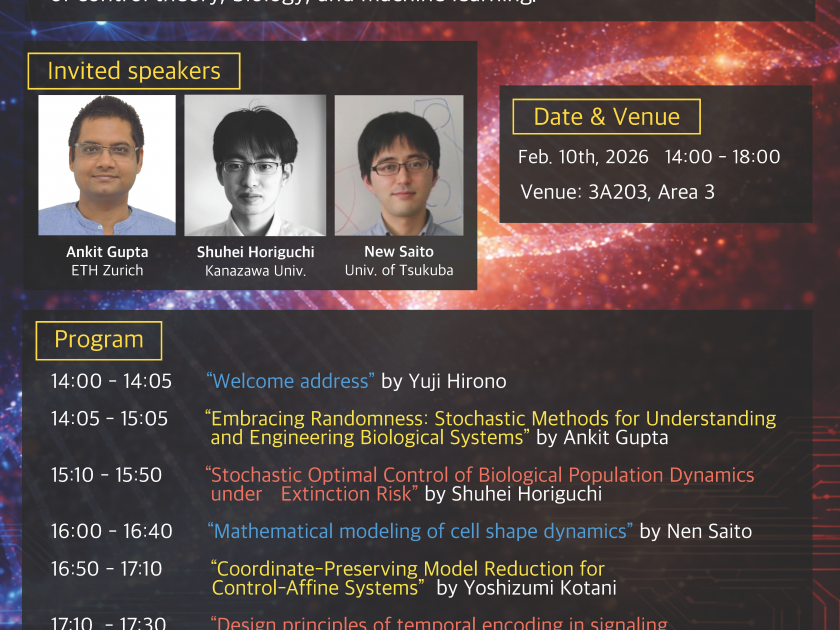 MDA教育プログラムでは、筑波大学の学生・教員と外部研究者との接点を 作ることを目的として、MDAワークショップという企画を開始しました。 本企画は、学外との研究交流を促進するとともに、 学内の分野横断的な学術交流のハブとなることを目指しています。 その第2回企画として、2月10日(火)に、 MDAワークショップ「Interfaces of control theory, biology, and